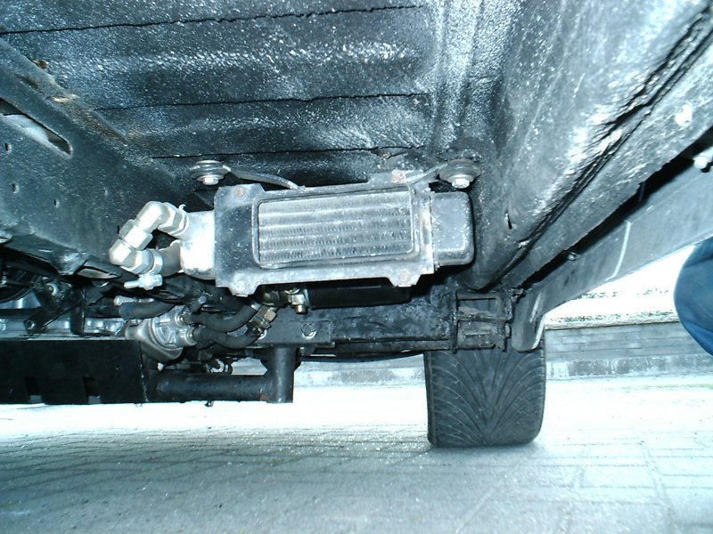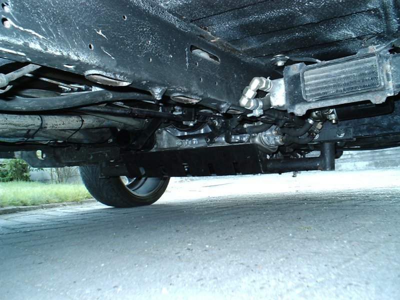 Blick von "knapp hinterm linkem Vorderrad" nach hinten Fahrerseite, zu sehen der Ölkühler, dahinter Filter und hinten links der Ölfilterflansch vom V6. Zusätzlicher Träger zur Versteifung, weil Serienquerträger (der zwischen den Schwingen) entfernt.