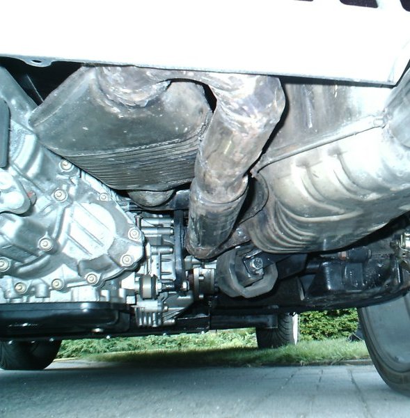 Vom Heckabschlussblech nach vorne fotografiert Beifahrerseite: Endtopf + Kat rechts, vorne Getriebelager, links Quattro-Tiptronik-Getriebe